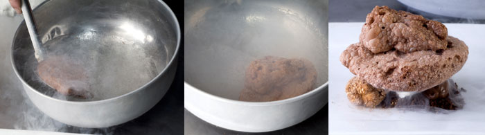 10- Proceed to remove the foam with a large slotted spoon and place it in the liquid nitrogen. With the help of another spoon, pour some liquid nitrogen on the cocoa air until it freezes completely.